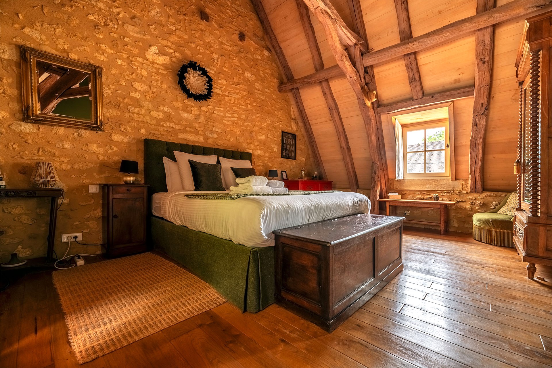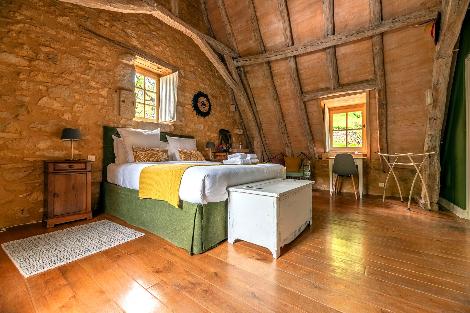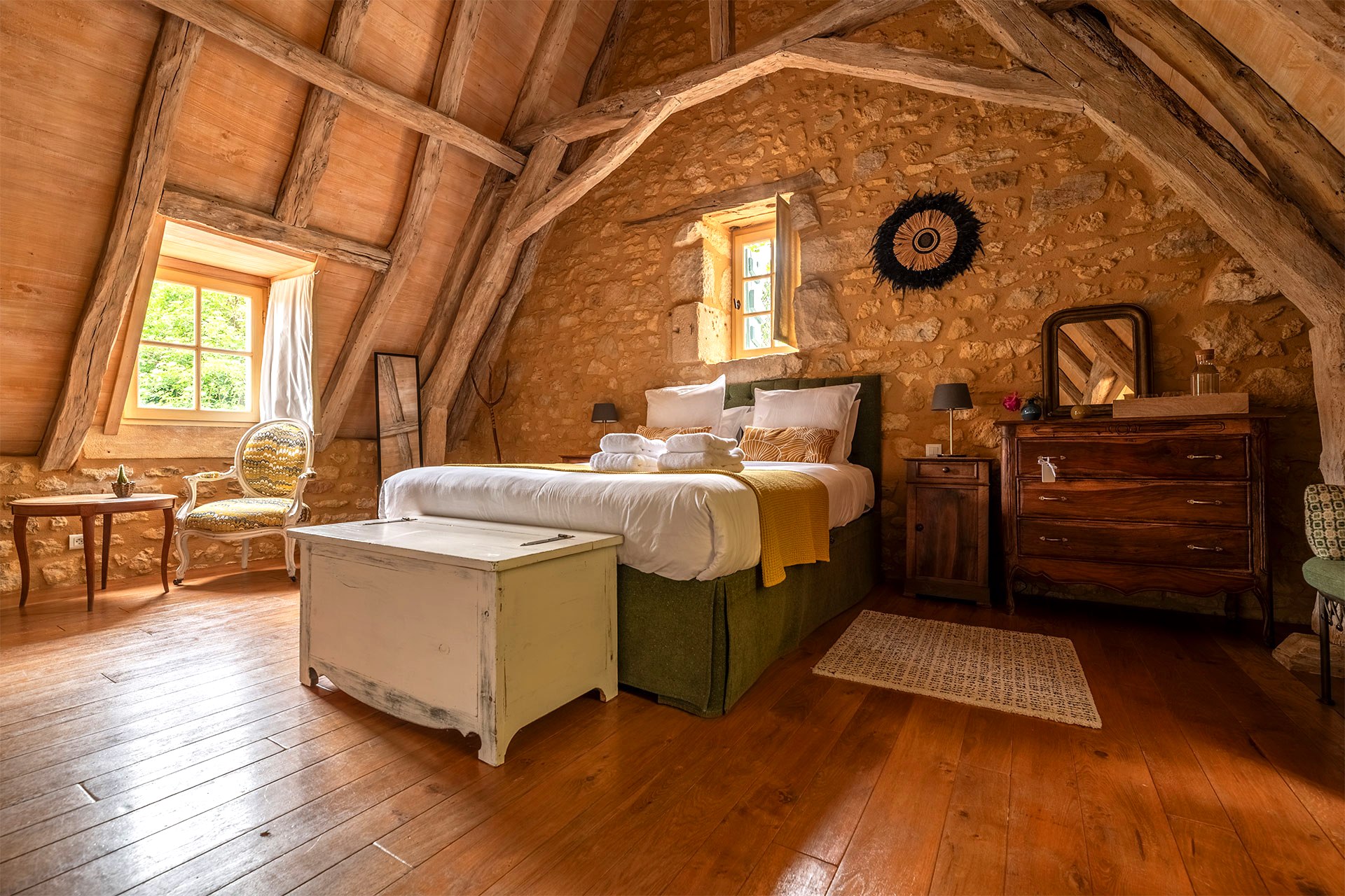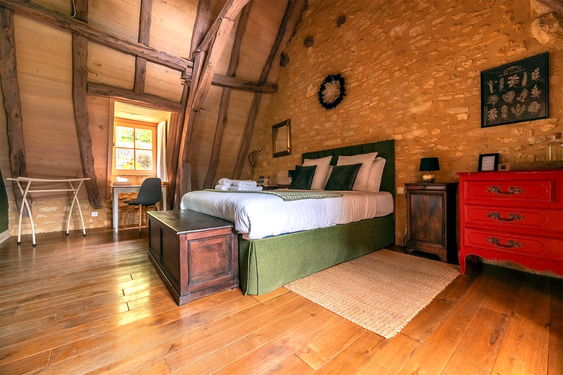 Chacune de nos chambres rend hommage à une figure emblématique de la Dordogne. Toutes disposent d’un lit double queen-size avec literie de qualité, d’un coin salon et d’une salle de bain de bain privative avec baignoire ou douche. Des portes-fenêtres ou des fenêtres donnent sur le jardin arboré ou sur notre jolie cour, où vous pourrez profiter d’un petit déjeuner maison aux beaux jours, composé de produits locaux et frais, et servi de 08h30 à 10h00.